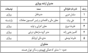 وی از مدیر گروه سازههای فراساحلی، معاونت اجرایی و امور تولید، معاونت مالی و اقتصادی و مدیر امور مالی بهعنوان مدیران ارشد پروازی نام برد؛ که در جدول زیر اسامی و پست سازمانی آنها آمده است.